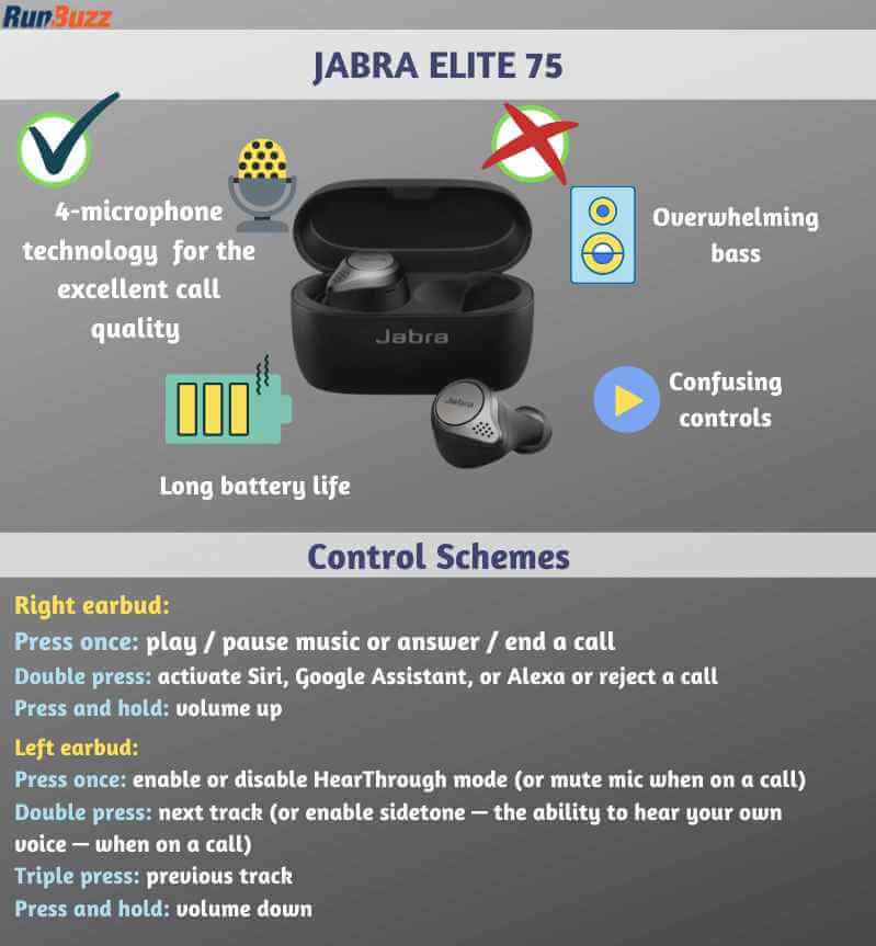 - The call quality is excellent, people will hear you loud and clear. This one of the main pros of Jabra Elite 75t due to the improved design with the two microphones at the front and the back of each earbud.