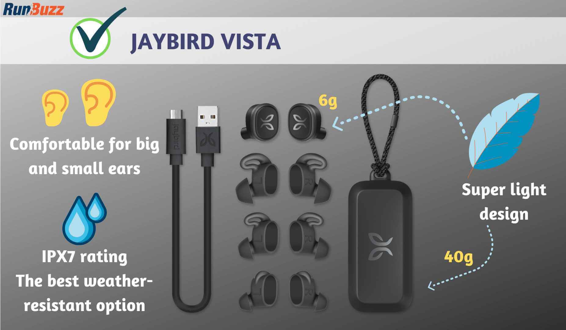 - Jaybird Vista’s headphones have a very comfortable design both for people with big and small ears. Instead of the classic silicone ear tip, these earbuds have a fully connected casing with an ear tip and fin. In the box, you’ll find three different sizes of ear tips and fins, and choose the one that fits better.