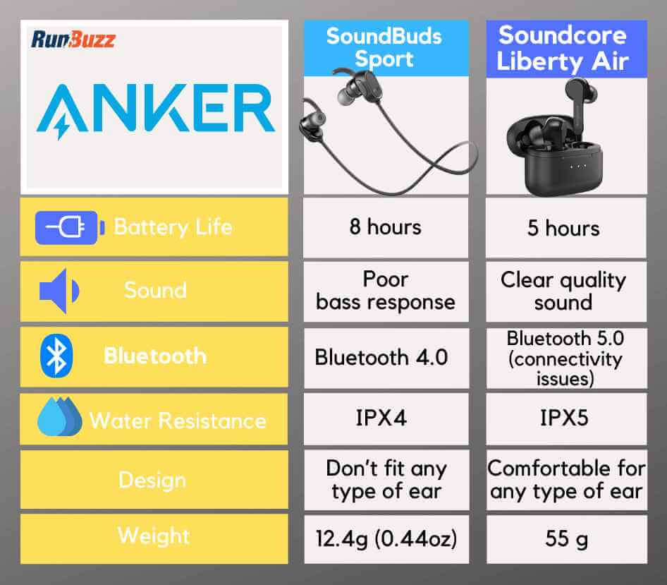 - The Anker SoundBuds Sport has a decent battery life of eight hours, which easily beats such premium options as Jaybird Vista and Aftershokz Trekz Air.