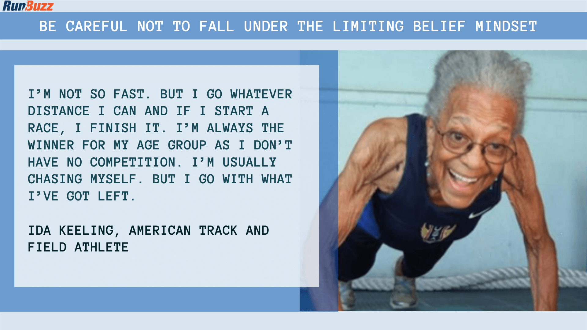 However, don't just assume and don't let that thought “I’m too old” get in your head. Don't ever let that get in your brain. I mean, there was five or six 80-year-olds running the New York Marathon this year and a couple of 70-year-olds in there as well. So shut up. Age is relative. My goal is to run you guys into our 70s and 80s. That would be really, really cool.