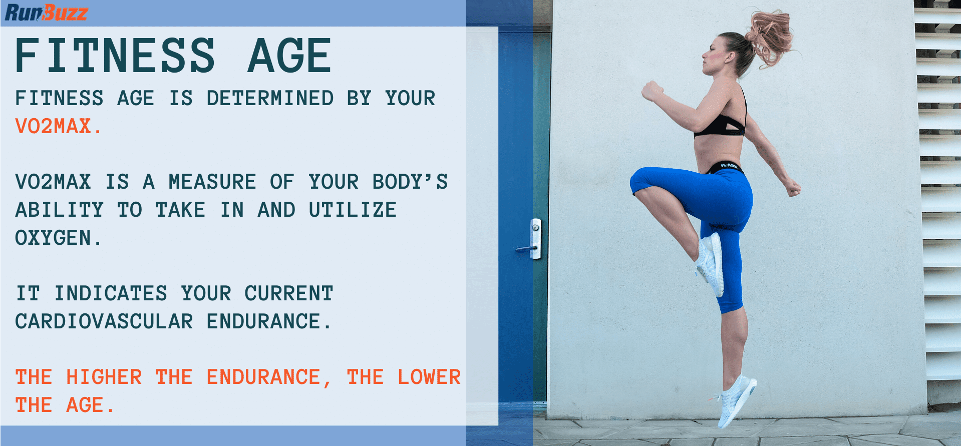 - Our fitness age is how long we've been fit. So a former 24-year-old couch potato may have only been running three months, they have a fitness age of three months. While a 50-year-old runner may have been running for three years, and may be in the incredible shape.