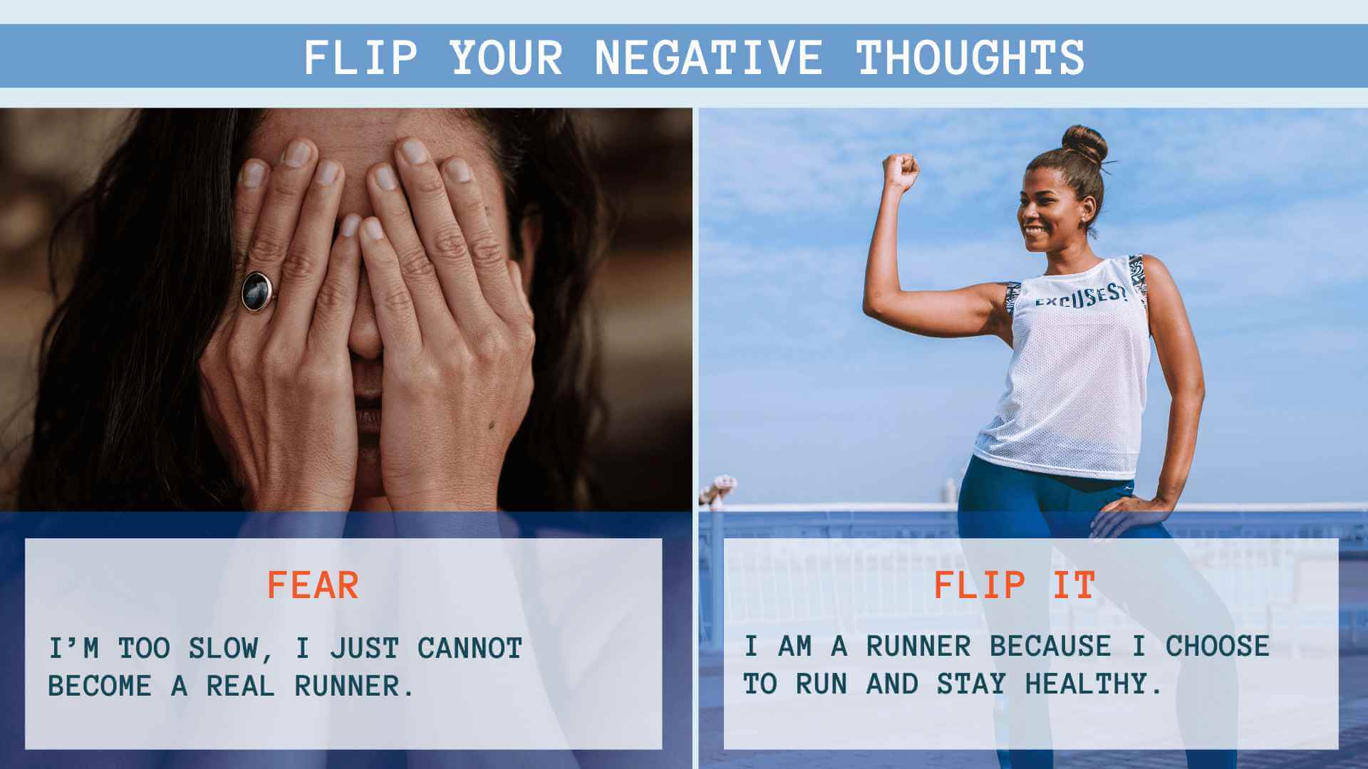 Another reason we kind of fall off the running is that we often have lots of self-doubt or thoughts that we're too busy. That's normal, but we have to get on with it, we have to move on, and actually, there's a technique. It's called redirection, and that's a great technique for dealing with negative thoughts that may enter your brain. The negative thoughts can be like “I’m bad”, “I’m just not a good runner” or “Well, I think I'll just push off my run until tomorrow”. These are certainly negative thoughts that come and go and pop in our heads all the time.